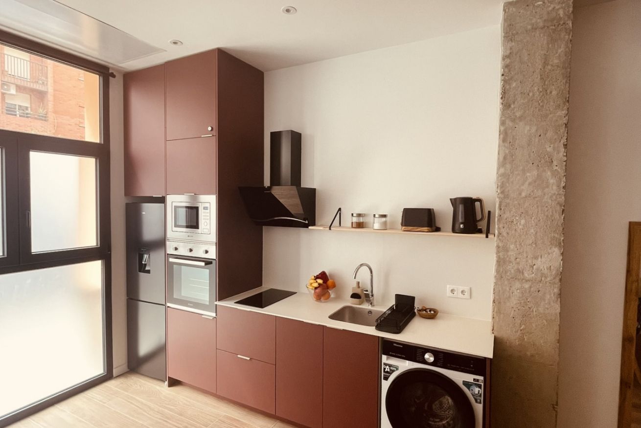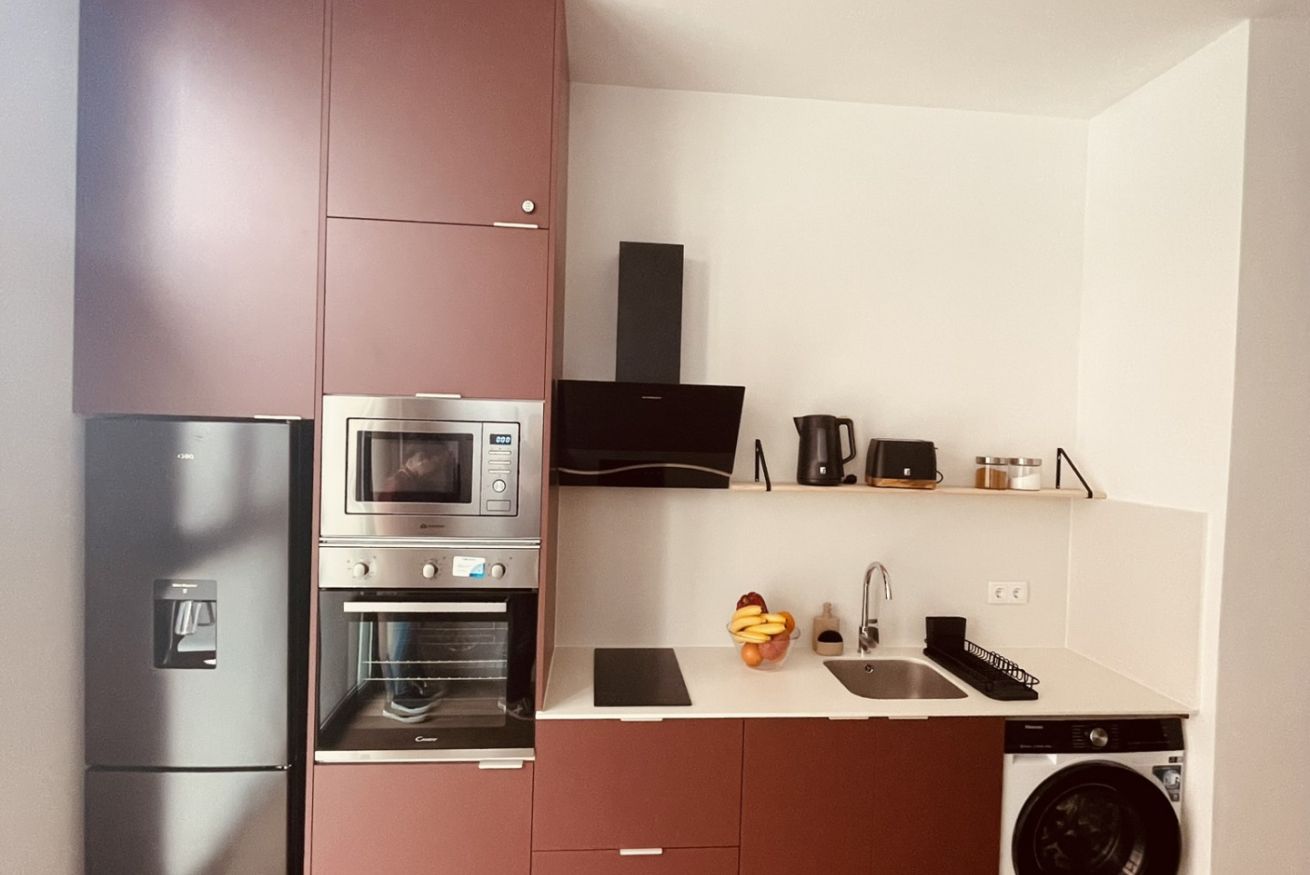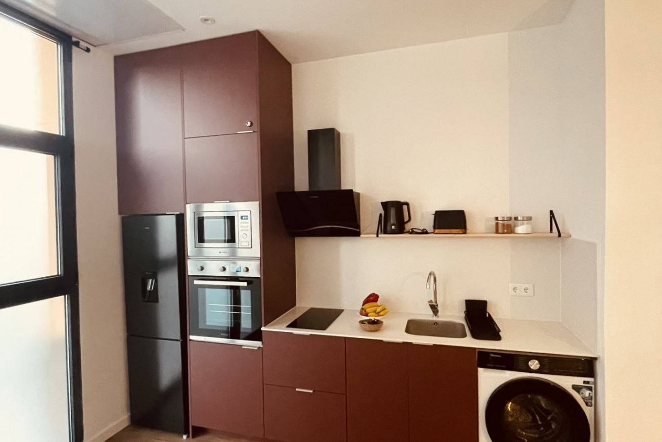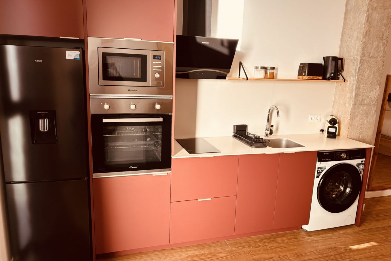 • Cocina equipada: moderna y funcional, perfecta para estancias cortas o medias. Incluye nevera, placa de inducción, horno, microondas, cafetera Nespresso y menaje completo.