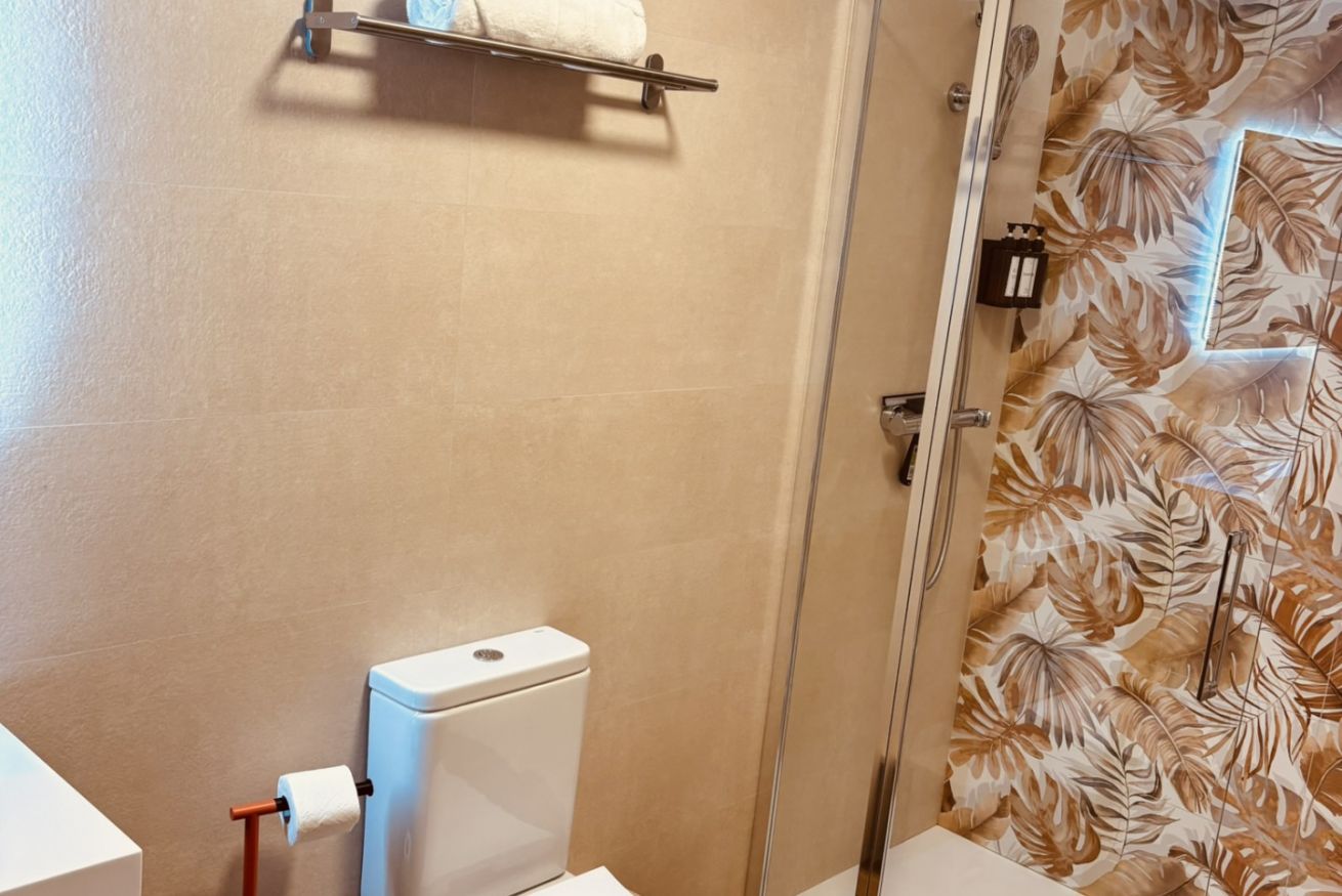 • Baño privado con ducha amplia, toallas suaves, secador de pelo, productos básicos de aseo y acabados modernos.